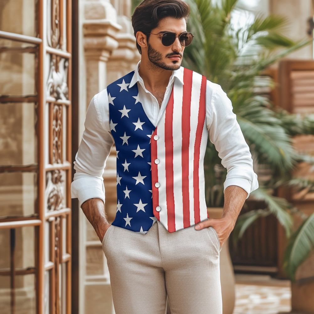 Stand out and celebrate your style with this American Flag Inspired Suit Vest Jacket. Add it to your collection today.