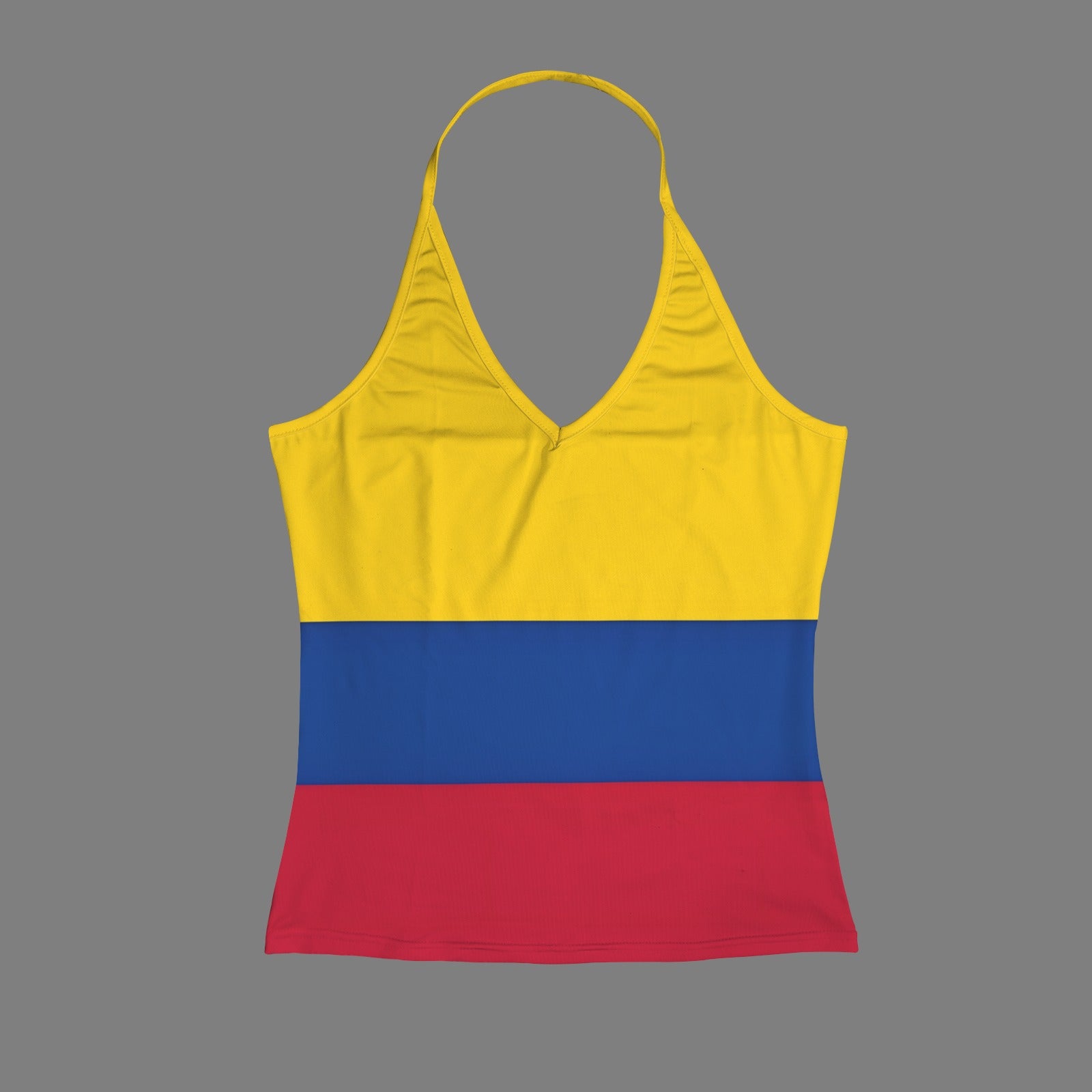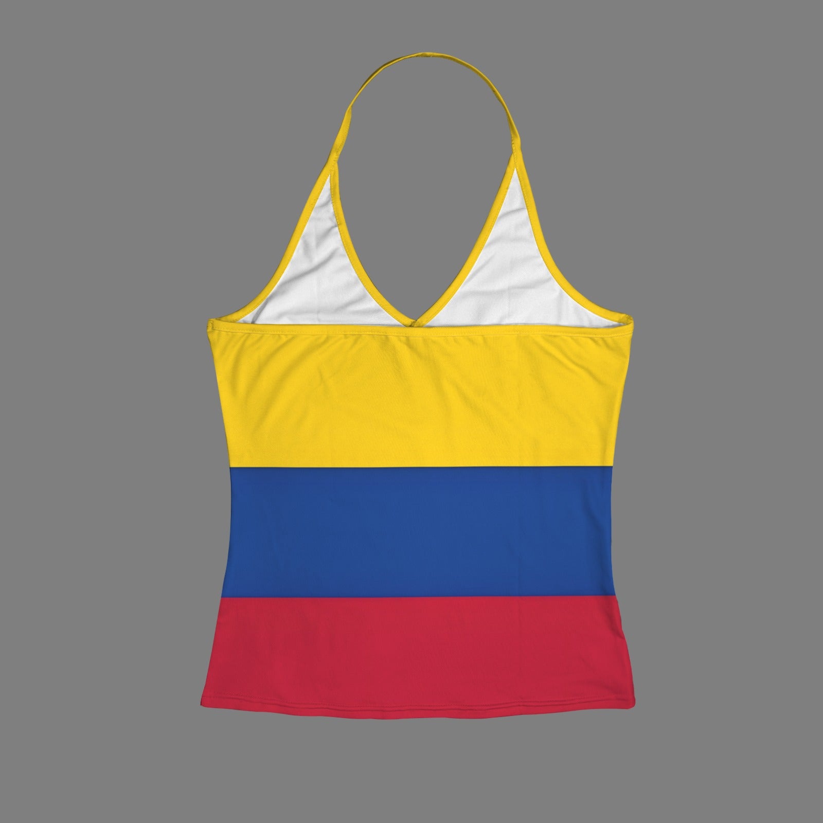Stand out and celebrate your style with this Colombia Flag Inspired V-neck Halter Open Back Tank Top. Add it to your collection today.