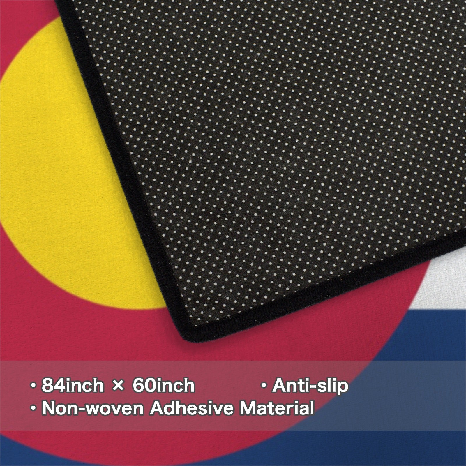 Show your style and pride with our Colorado Flag Inspired Area Rug with Black Binding (Made in the USA). Designed with quality materials and crafted for impact, this piece is perfect for everyday use or special occasions. This 84×60 in. area rug features flannel with thickened non-woven fabric, a luxurious plush surface, a non-slip bottom with small dots for enhanced grip, and a black fixed bias binding for a clean, polished finish.