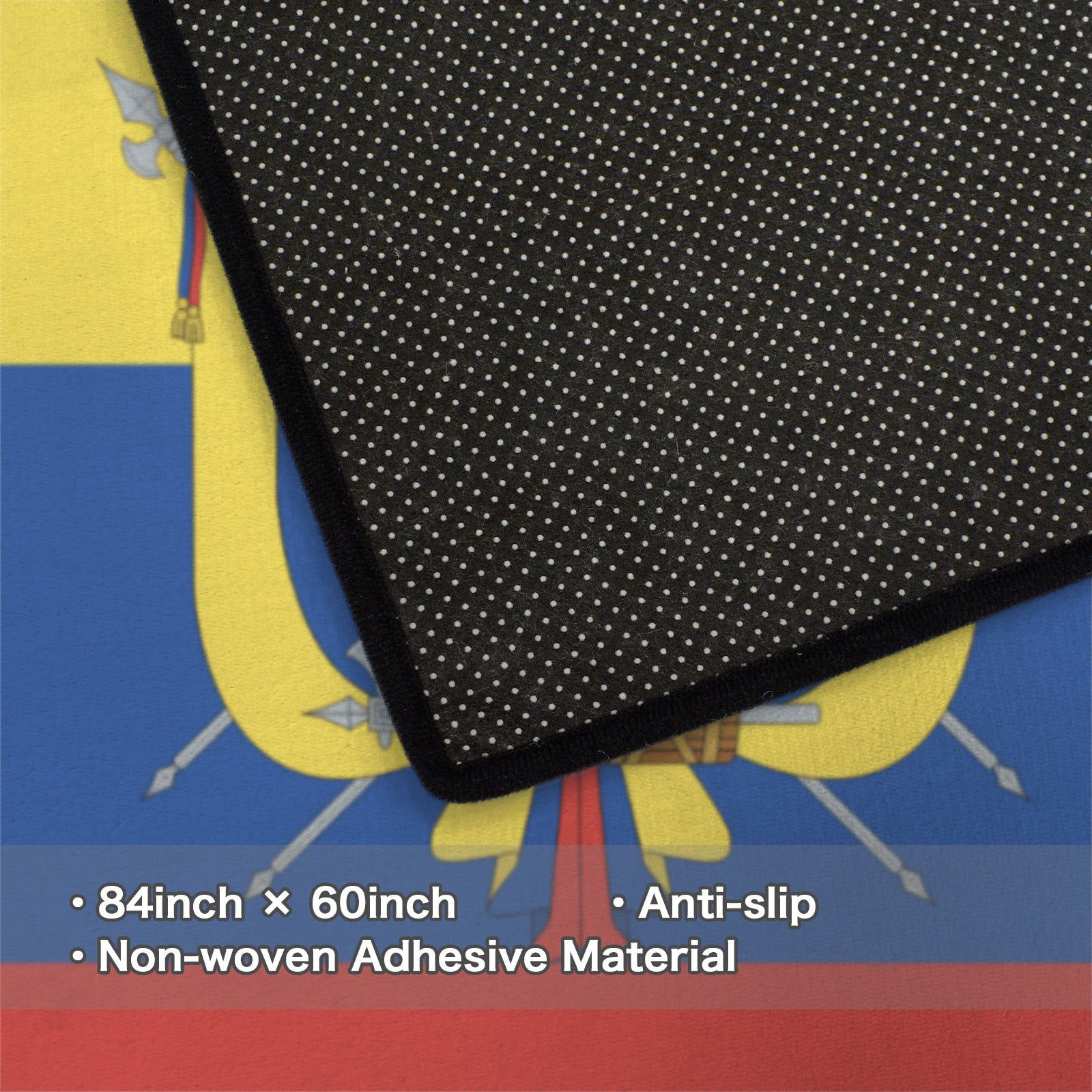 Show your style and pride with our Ecuador Flag Inspired Area Rug with Black Binding (Made in the USA). Designed with quality materials and crafted for impact, this piece is perfect for everyday use or special occasions. This 84×60 in. area rug features flannel with thickened non-woven fabric, a luxurious plush surface, a non-slip bottom with small dots for enhanced grip, and a black fixed bias binding for a clean, polished finish.