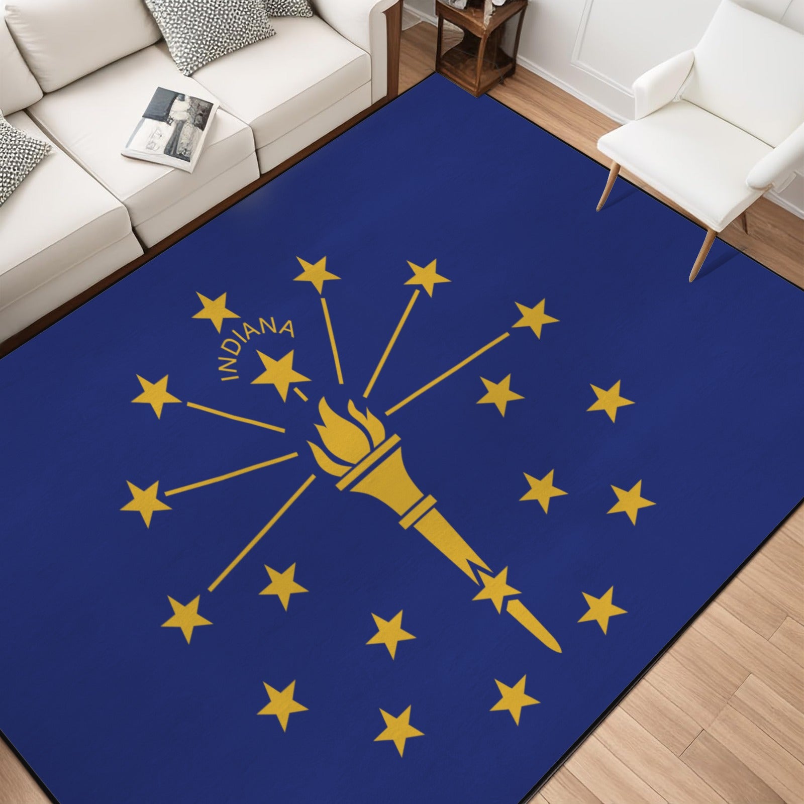 Show your style and pride with our Indiana Flag Inspired Area Rug with Black Binding (Made in the USA). Designed with quality materials and crafted for impact, this piece is perfect for everyday use or special occasions. This 84×60 in. area rug features flannel with thickened non-woven fabric, a luxurious plush surface, a non-slip bottom with small dots for enhanced grip, and a black fixed bias binding for a clean, polished finish.