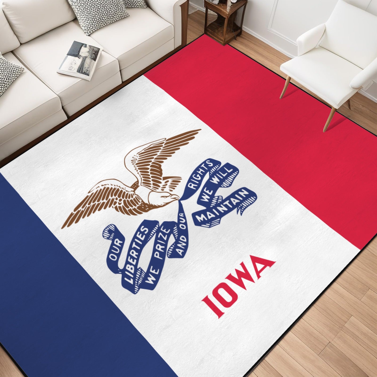 Show your style and pride with our Iowa Flag Inspired Area Rug with Black Binding (Made in the USA). Designed with quality materials and crafted for impact, this piece is perfect for everyday use or special occasions. This 84×60 in. area rug features flannel with thickened non-woven fabric, a luxurious plush surface, a non-slip bottom with small dots for enhanced grip, and a black fixed bias binding for a clean, polished finish.