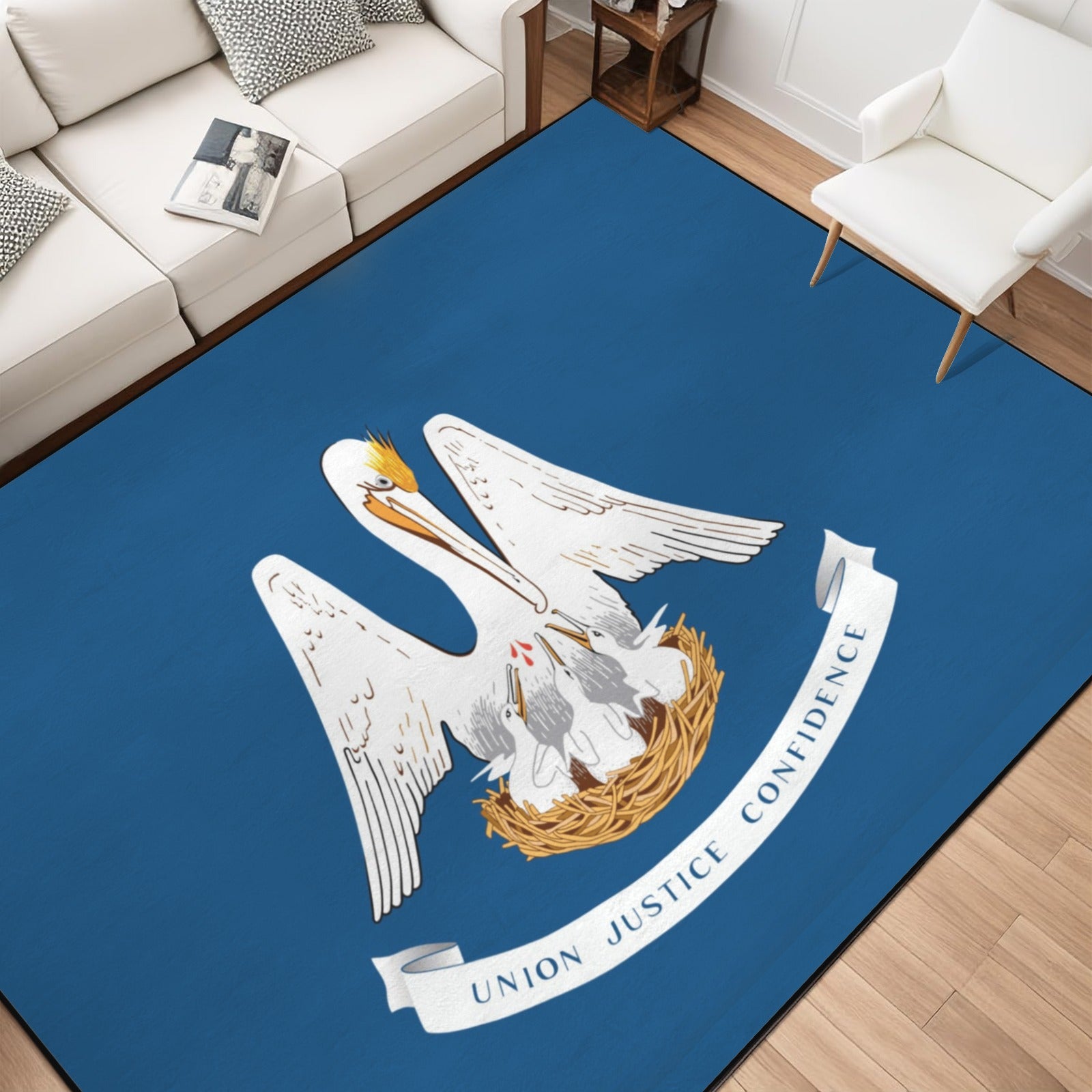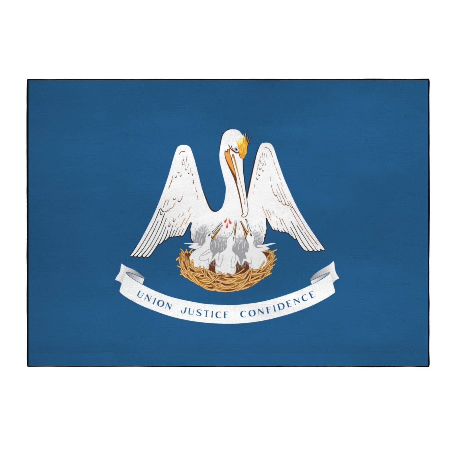 Show your style and pride with our Louisiana Flag Inspired Area Rug with Black Binding (Made in the USA). Designed with quality materials and crafted for impact, this piece is perfect for everyday use or special occasions. This 84×60 in. area rug features flannel with thickened non-woven fabric, a luxurious plush surface, a non-slip bottom with small dots for enhanced grip, and a black fixed bias binding for a clean, polished finish.