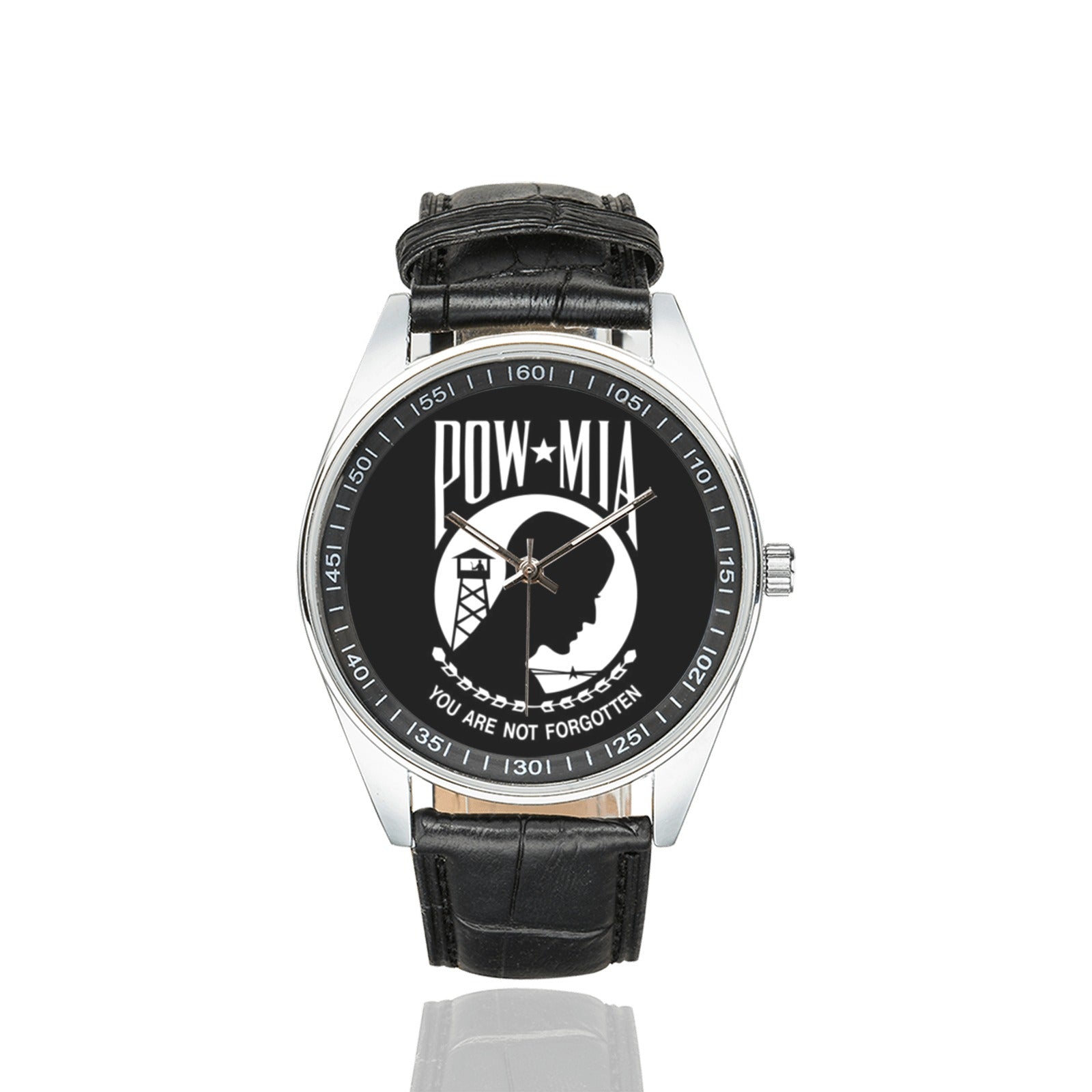 Stand out and celebrate your style with this POW/MIA Flag Inspired Men’s Casual Leather Strap Watch. Add it to your collection today.