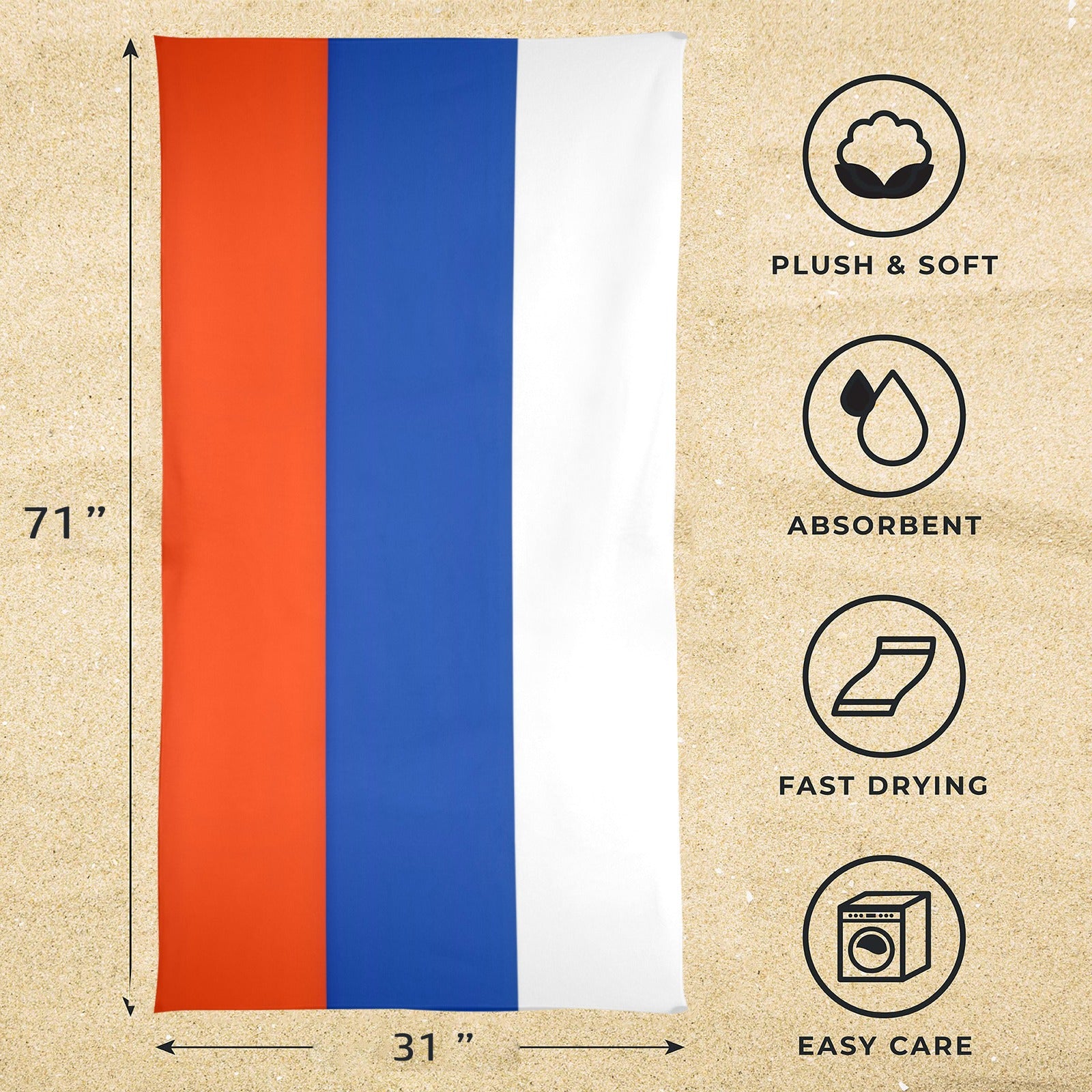 Show your style and pride with our Russia Flag Inspired Beach Towel 31”x71”. Designed with quality materials and crafted for impact, this piece is perfect for everyday use or special occasions. Whether you’re lounging on the beach, drying off after a swim, or practicing yoga on the sand, this towel delivers comfort, performance, and a striking look.