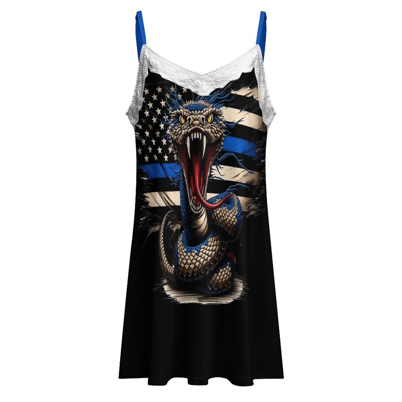 Stand out and celebrate your style with this Thin Blue Line Flag Inspired (distressed with snake) Camisole Nightgown with Lace Trim. Add it to your collection today.