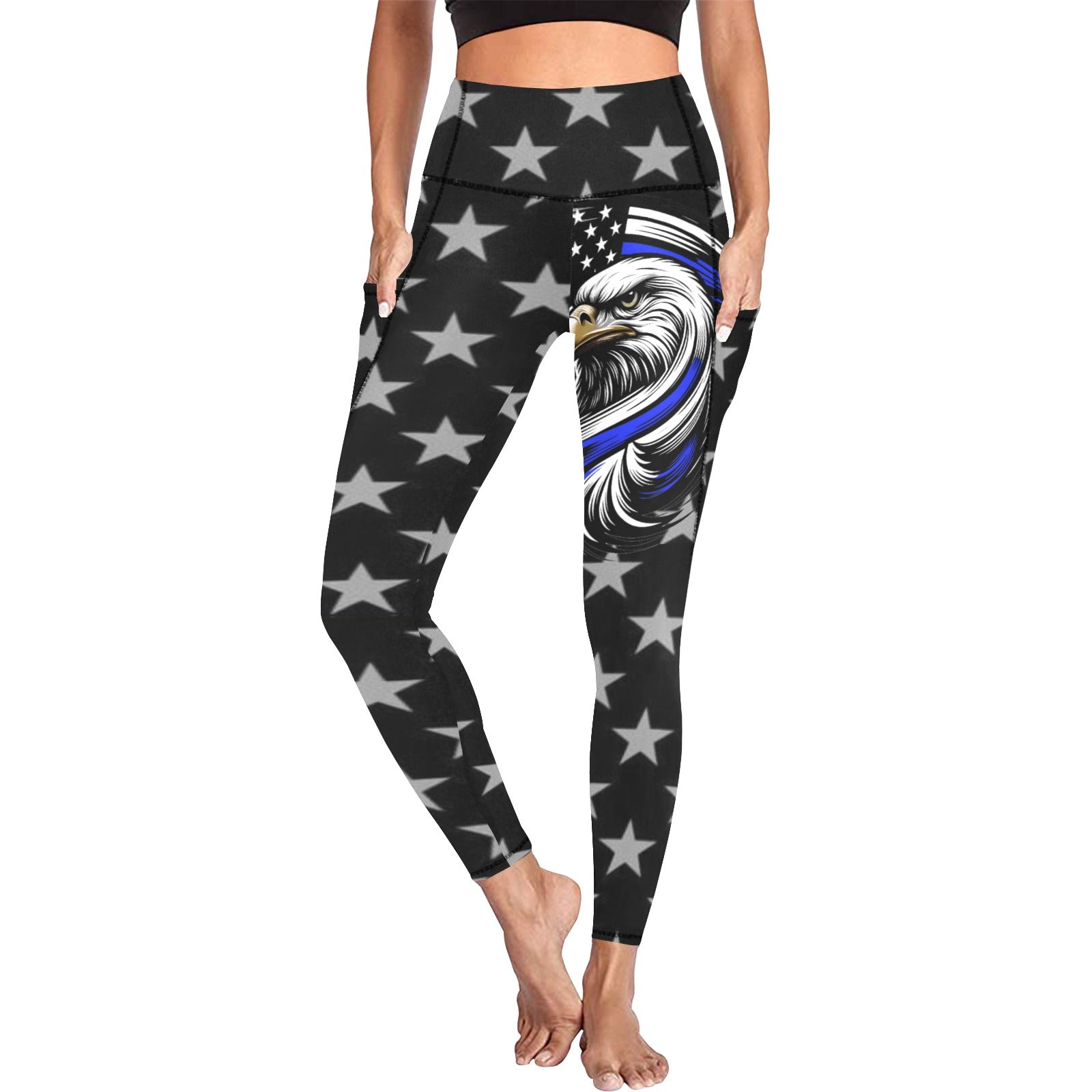 Thin Blue Line Flag Inspired Eagle Women's High Waist Leggings with Pockets