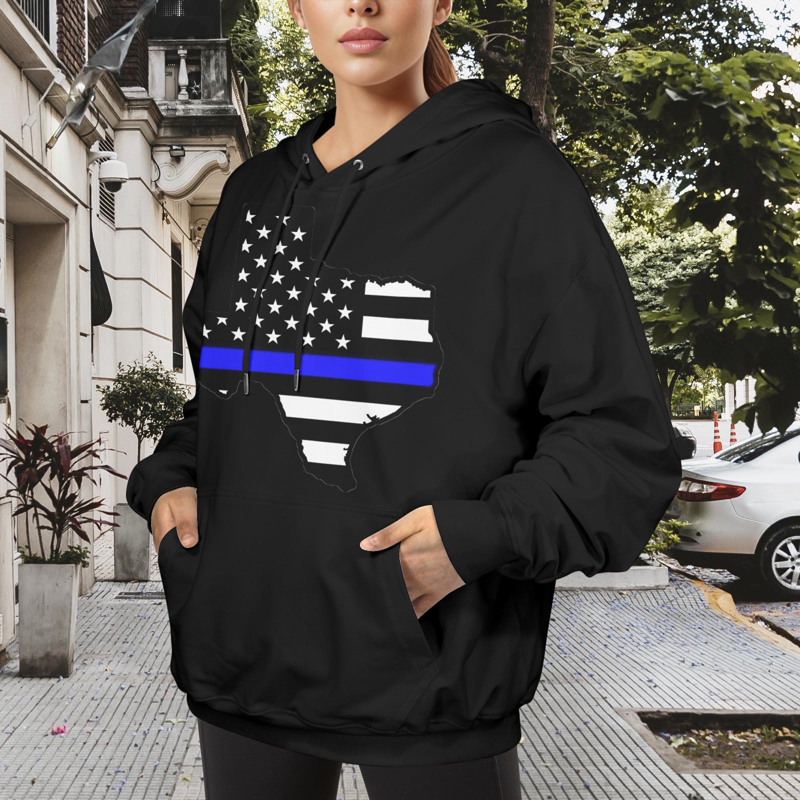 Stand out and celebrate your style with this Thin Blue Line Flag Inspired Texas Women’s Hoodie Made in the USA. Add it to your collection today.
