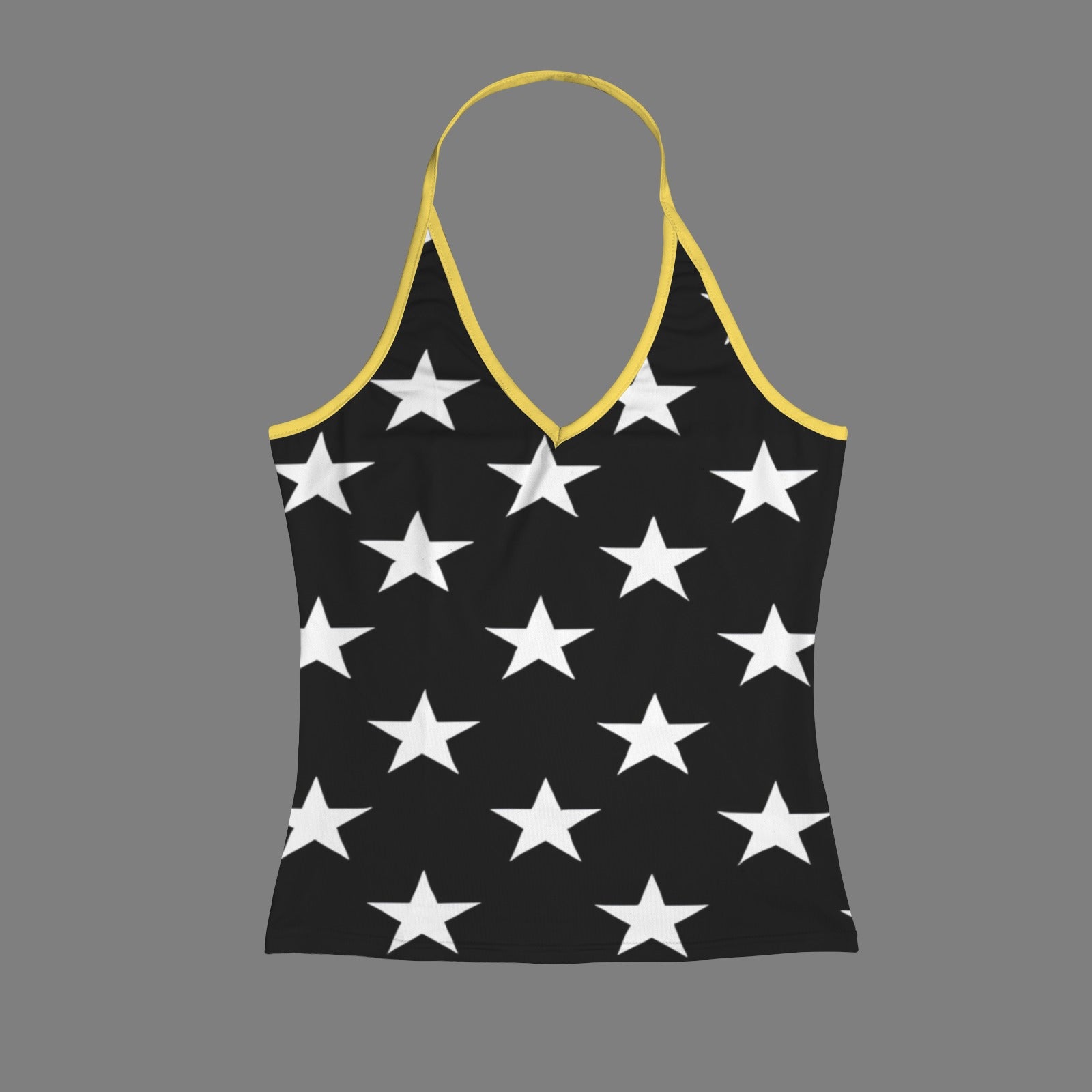 Stand out and celebrate your style with this Thin Gold Line Flag Inspired V-neck Halter Open Back Tank Top. Add it to your collection today.