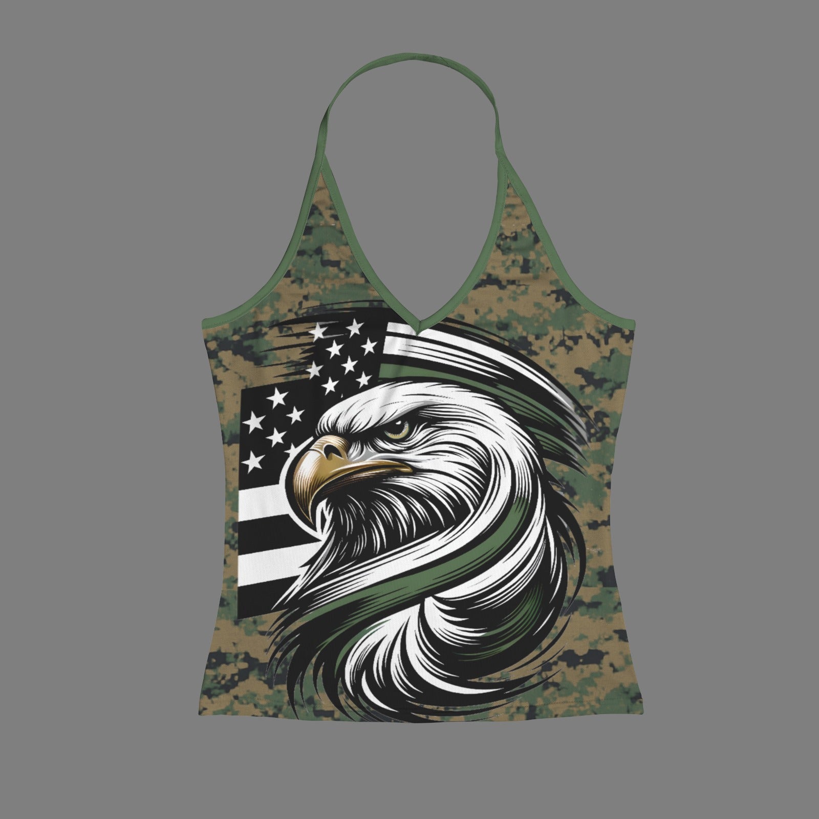 Thin Green Line Flag Inspired Eagle on Digital Camo V-neck Halter Open Back Tank Top