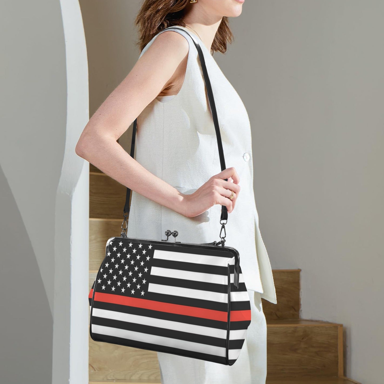 Thin Red Line Flag Inspired Kisslock Crossbody Shoulder Bag-Large