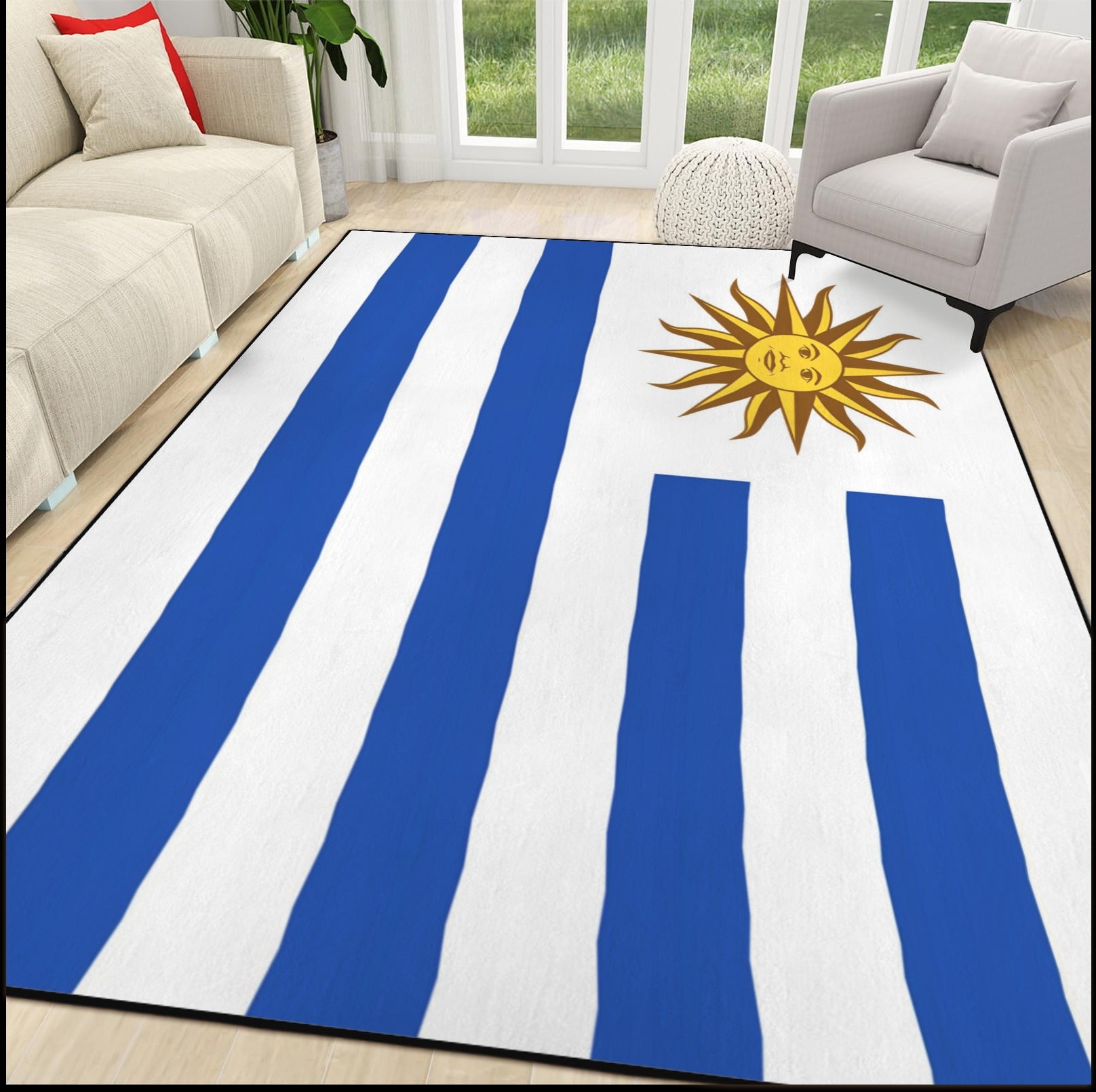 Show your style and pride with our Uruguay Flag Inspired Area Rug with Black Binding (Made in the USA). Designed with quality materials and crafted for impact, this piece is perfect for everyday use or special occasions. This 84×60 in. area rug features flannel with thickened non-woven fabric, a luxurious plush surface, a non-slip bottom with small dots for enhanced grip, and a black fixed bias binding for a clean, polished finish.