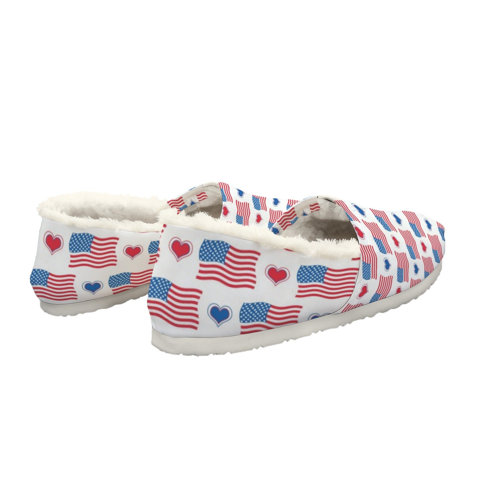Stand out and celebrate your style with this USA/American Flag Inspired Flag and Hearts Pattern Women’s Fleece-Lined Canvas Slip-On. Add it to your collection today.