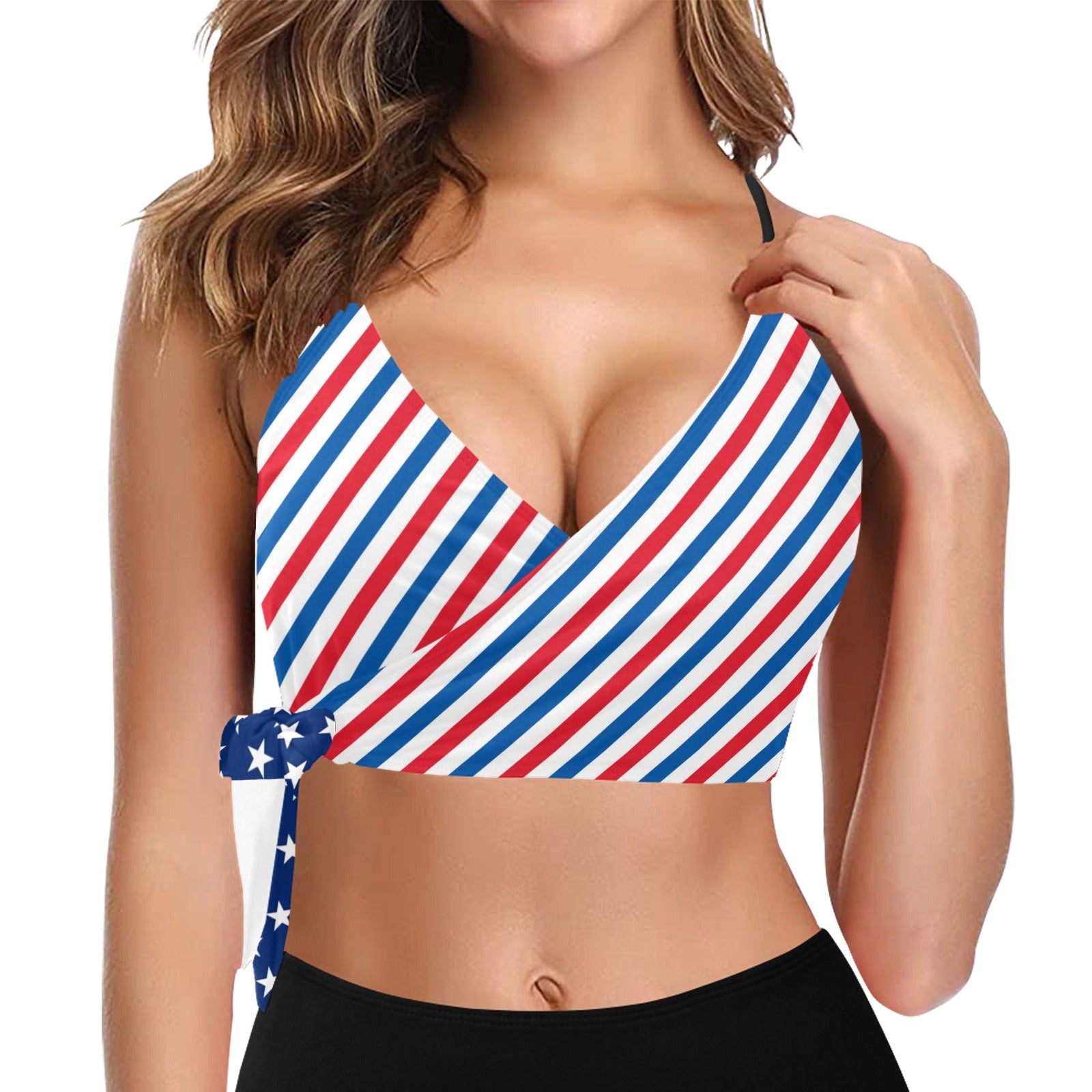 Stand out and celebrate your style with this USA/American Flag Inspired Striped Pattern Knot Side Bikini Top. Add it to your collection today.
