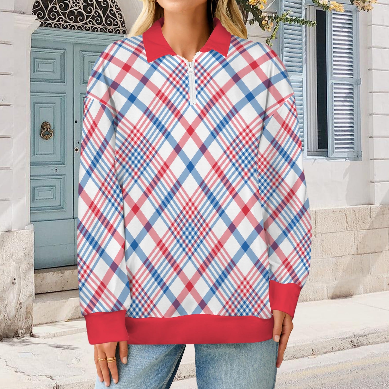 USA/American Flag Plaid Pattern Women's Quarter Zip Pullover Sweatshirt