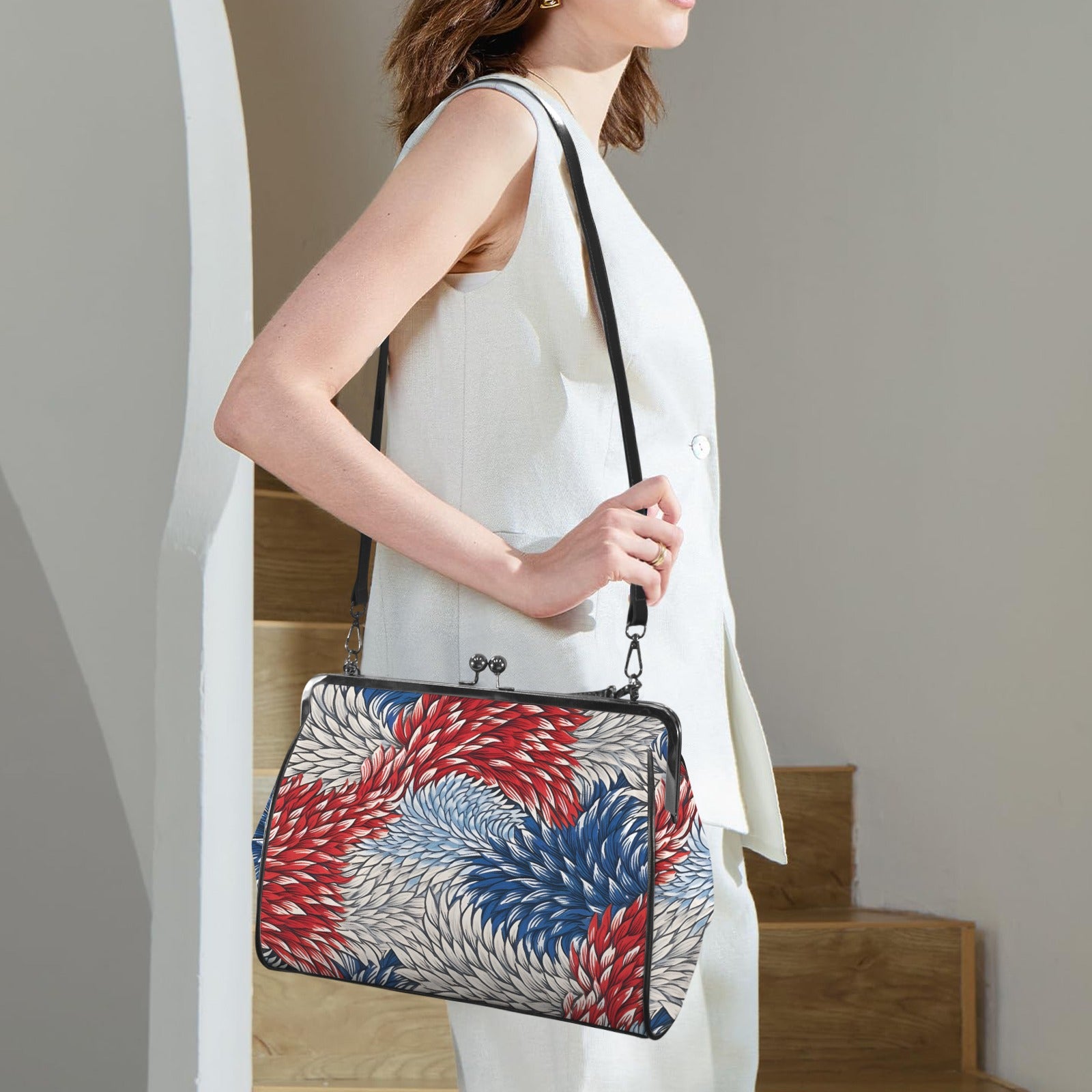 USA/American Flag Red White & Blue Floral Pattern Kisslock Crossbody Shoulder Bag-Large